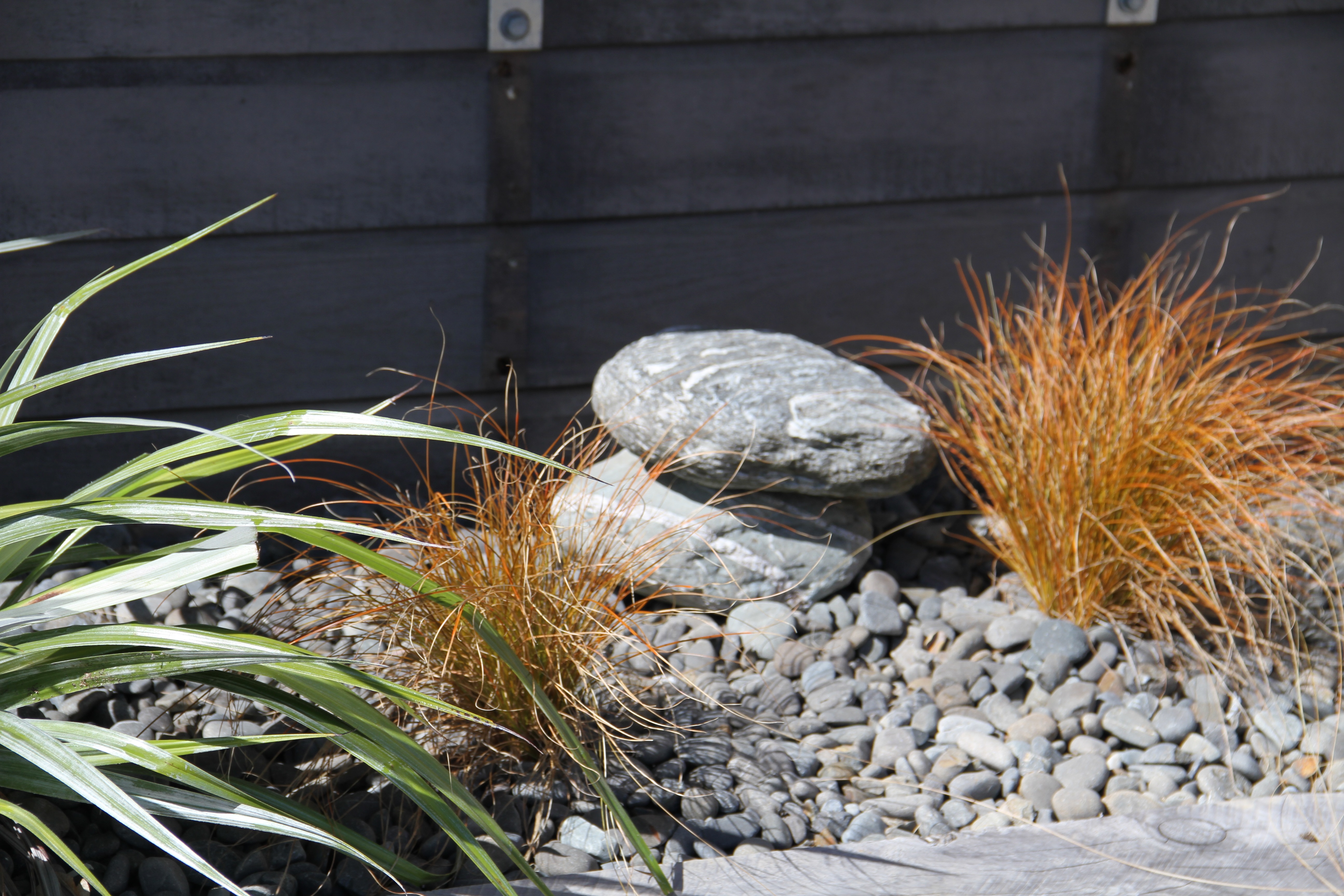 • What I liked most about Karen's approach was she really listened as in the beginning I was not at all sure what I wanted to do with the space.It seemed like a daunting job to me removing a swimming pool, building a new retaining wall and landscaping aesthetically to suit my property.Her relaxed, knowledgeable manner certainly made what seemed like a big job much easier.My brief was, I want to bring the birds in and a place for tranquil reflection at the end of a busy day, which people can enjoy whilst there and looking down from the top deck.Now a few years on the garden looks as though it has always been there, the flax is flowering this year and the tuis dance through the growth. The trees have fruited, and the rosemary I use for ceremonies. It is perfect and I am so proud to show my family and friends. So from disaster, swimming pool and deck moving down the bank to a back garden that is an expression of us. Thank you Karen. I have and will not have any hesitation referring her and the wonderful service she provides.